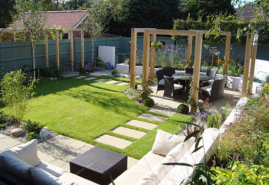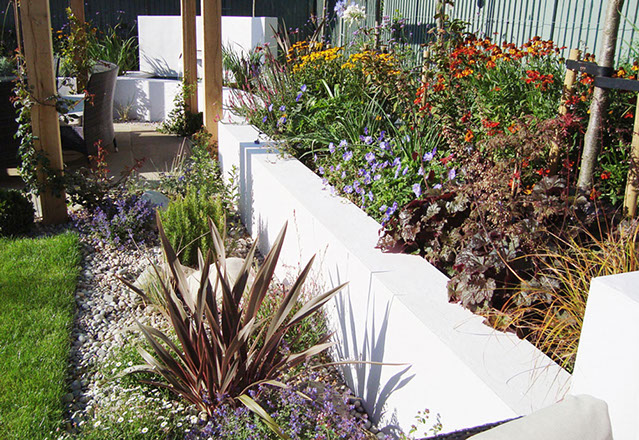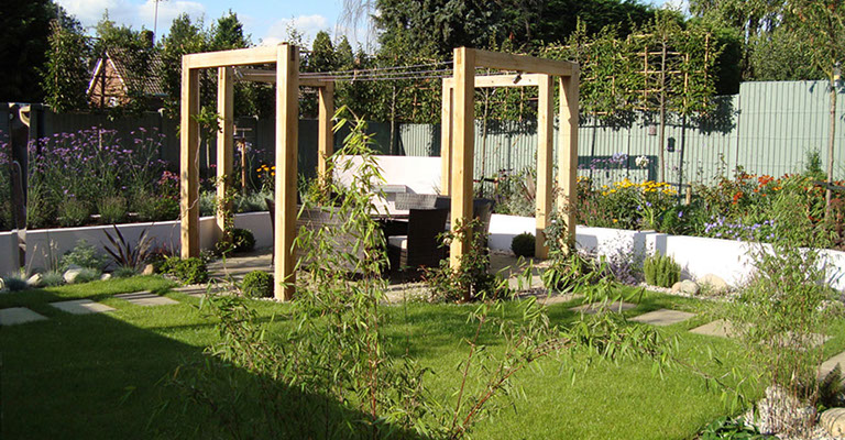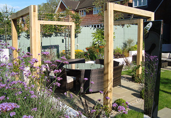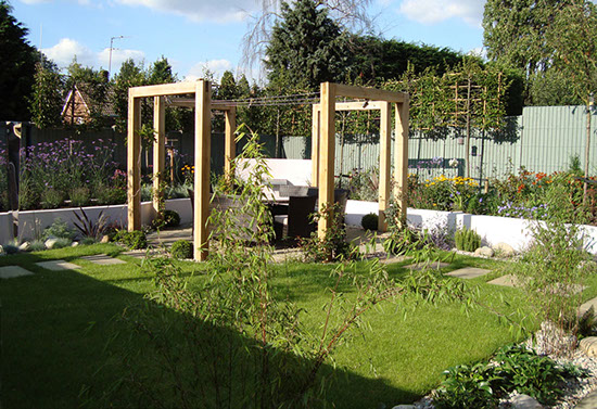 Strong, oak arches to hold scented climbers, and curved raised beds were created around it. Pleached trees screen the view of the neighbours and wildlife-friendly planting completes the picture.