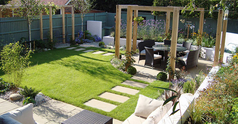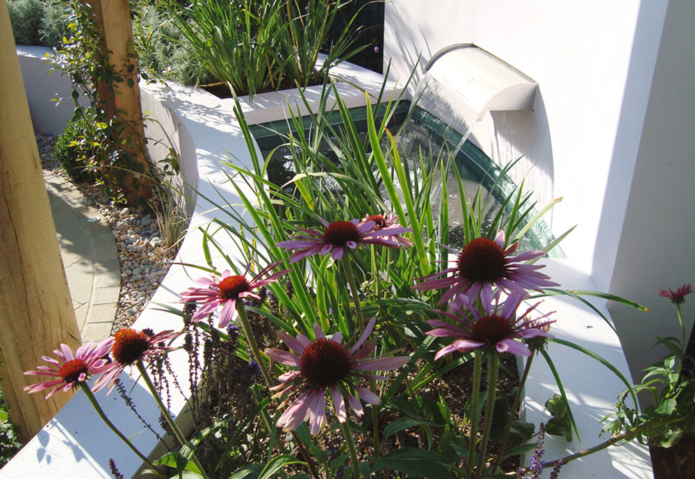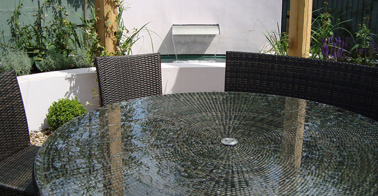 The house’s modern interior was reflected in the styling of the outside space, in the furniture, stainless steel sculpture and bespoke water feature.