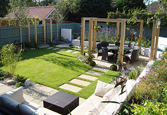 An existing patio was in shade most of the day, yet a sunny spot was required for entertaining. The solution was to build a new patio further out in the garden.