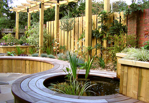 In order to provide light for the plants, raised beds were built. At two different heights, one accommodated the curved seating which seguéd into the pond’s edge, the other gave the garden 3D interest.