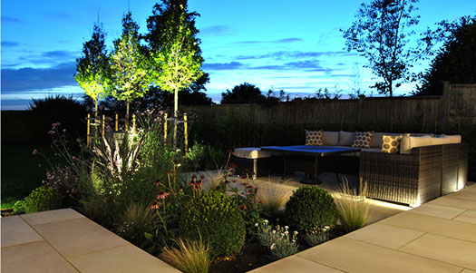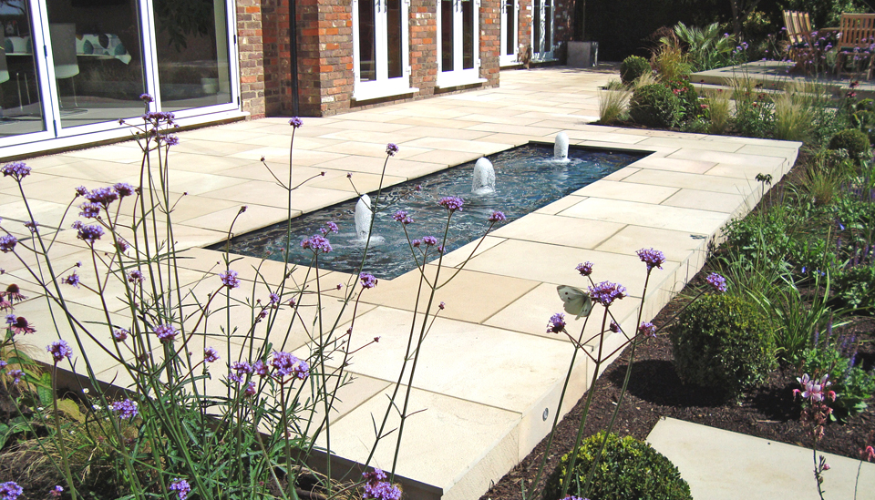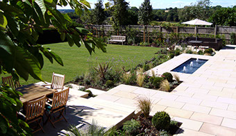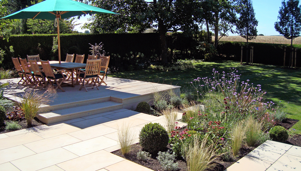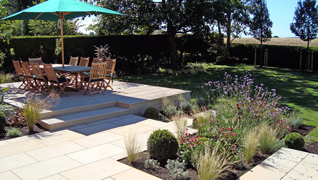 Smooth sawn sandstone was teamed with Millboard deck in complementary colours to create the level changes.