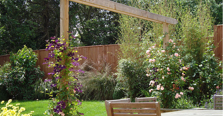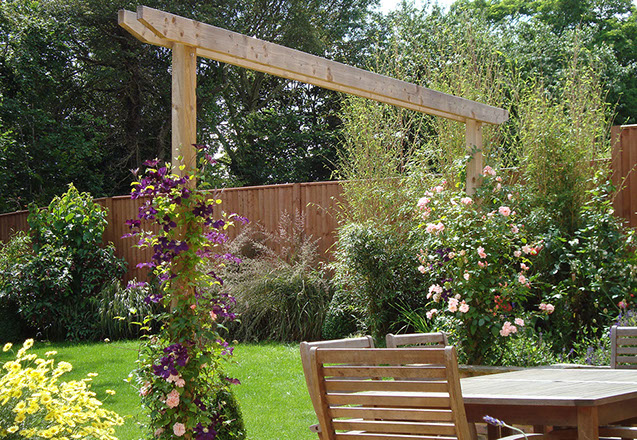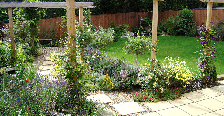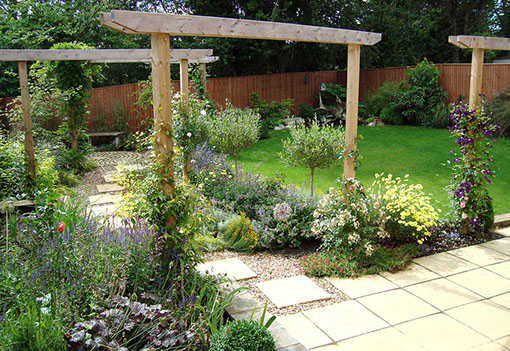 The existing patio was extended to allow for more expansive entertaining. A curved stepping stone path beneath scented, climber-clad arches now leads to a small circular seating area - for a relaxing gin and tonic in the late afternoon sun.