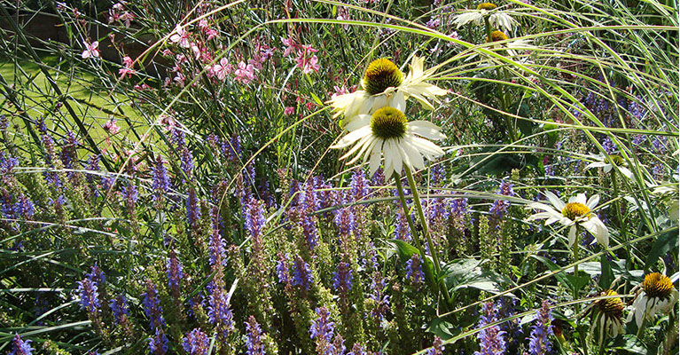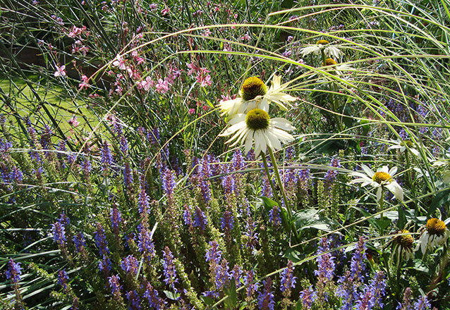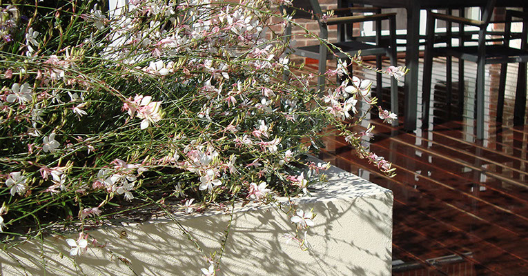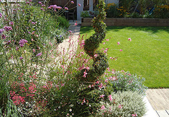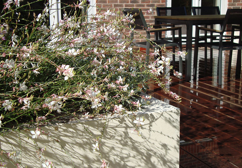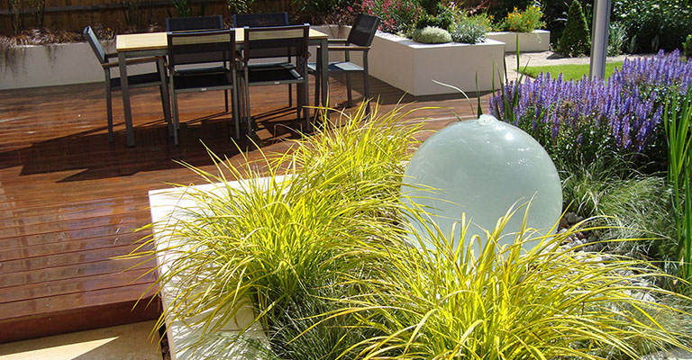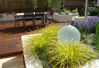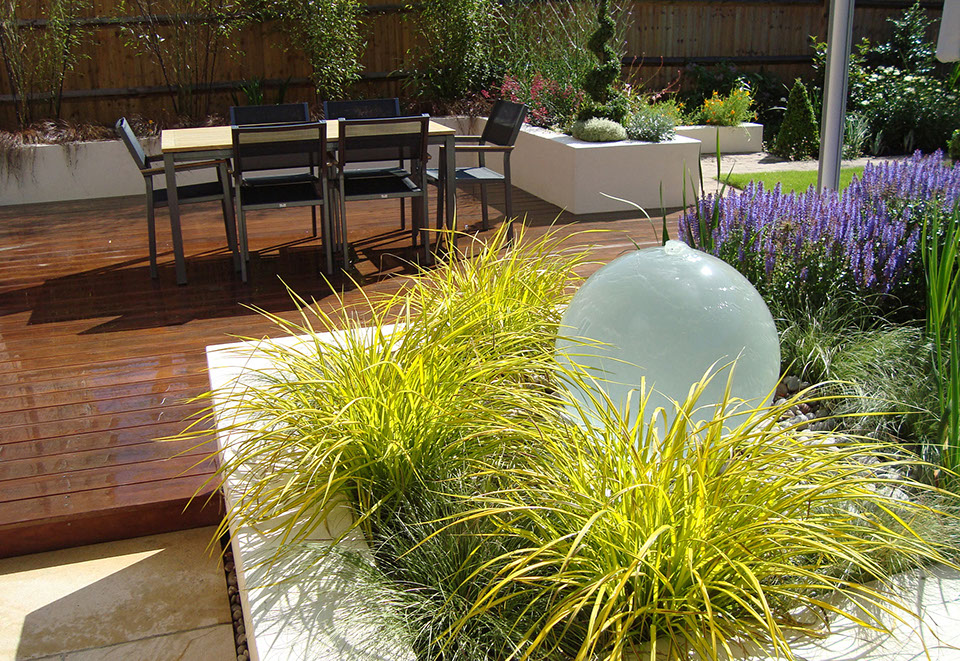 At night an internally lit spherical water feature lights the dining area. It looks as if the moon has landed in the adjacent bed and gives gentle sound and movement to the garden.