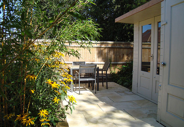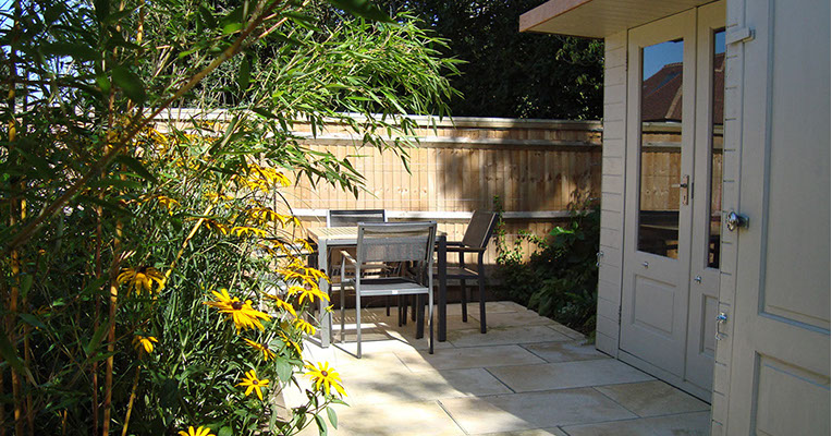 This afternoon-sun-space leads onto the children’s play area. Golden bamboos soften the play equipment, viewed from the rest of the garden.