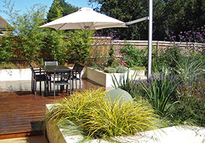 To accomodate all these desires, yet create the feeling of uncluttered space, required careful planning. Raised beds divide the various areas and retain the slope of the land. A beautiful hardwood deck takes the house floor level out into the spacious, external dining area.