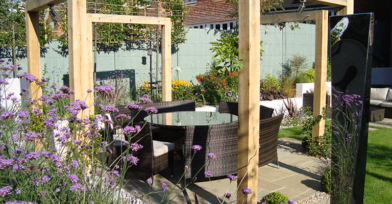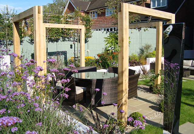 Strong, oak arches to hold scented climbers, and curved raised beds were created around it. Pleached trees screen the view of the neighbours and wildlife-friendly planting completes the picture.