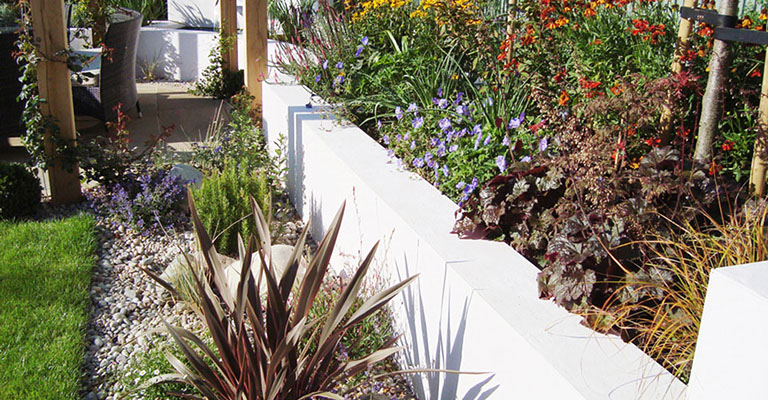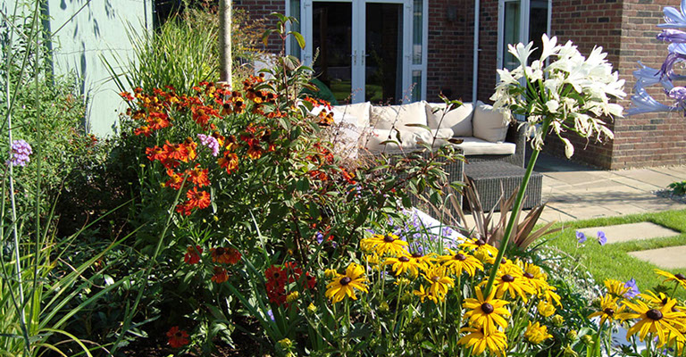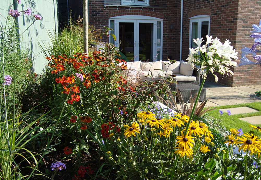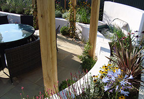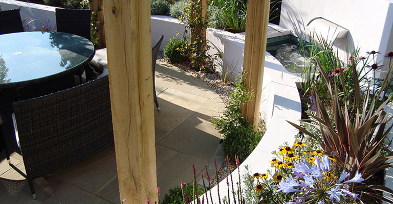 An existing patio was in shade most of the day, yet a sunny spot was required for entertaining. The solution was to build a new patio further out in the garden.