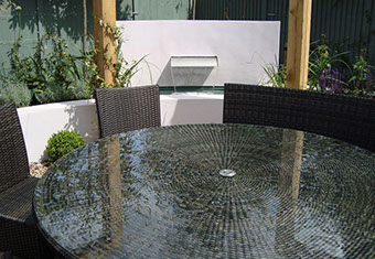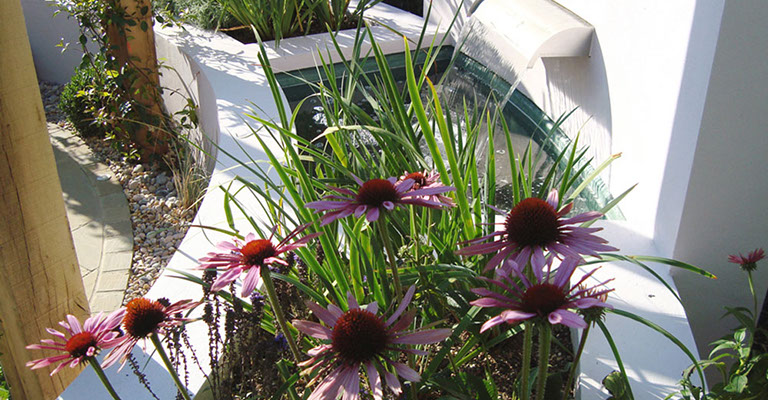 The house’s modern interior was reflected in the styling of the outside space, in the furniture, stainless steel sculpture and bespoke water feature.