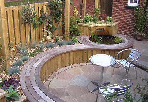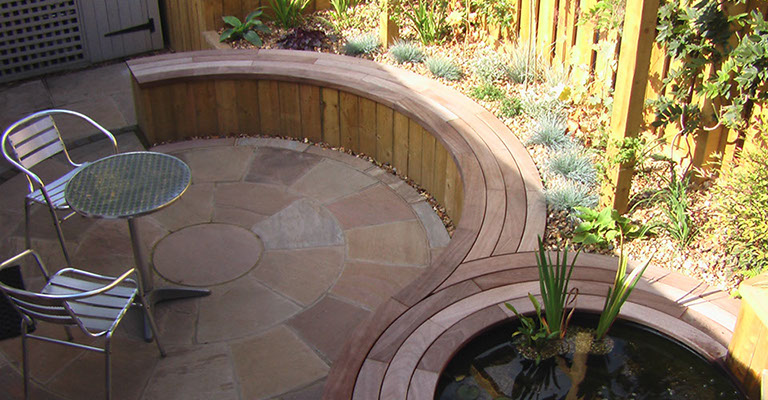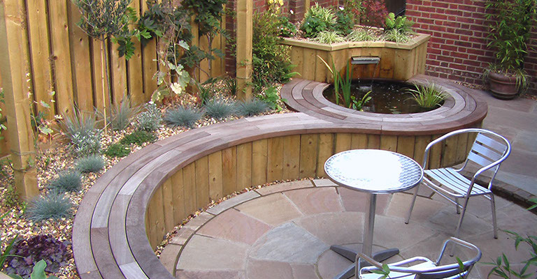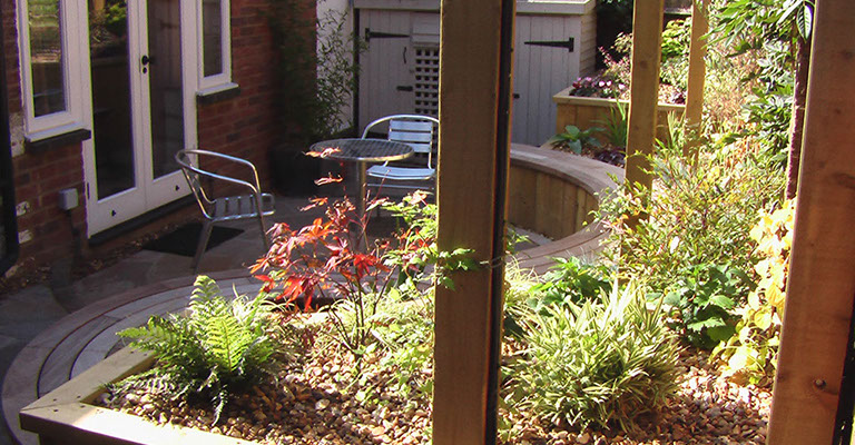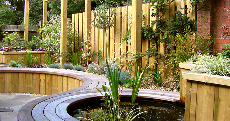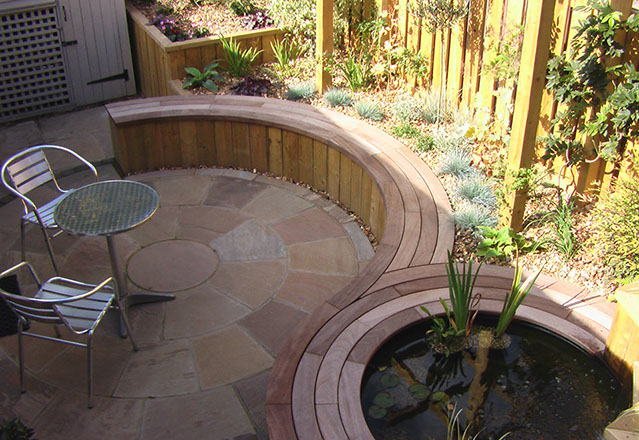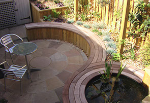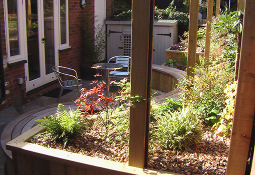 In order to provide light for the plants, raised beds were built. At two different heights, one accommodated the curved seating which seguéd into the pond’s edge, the other gave the garden 3D interest.