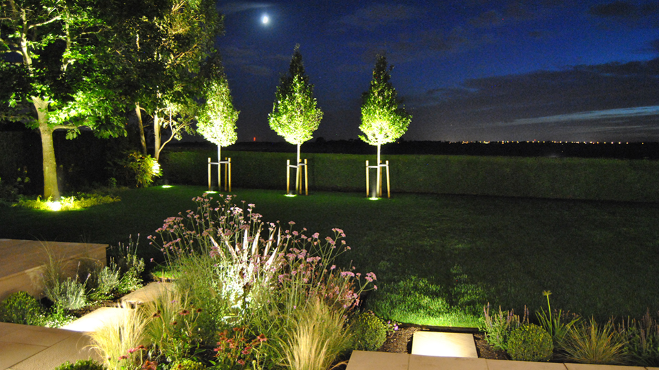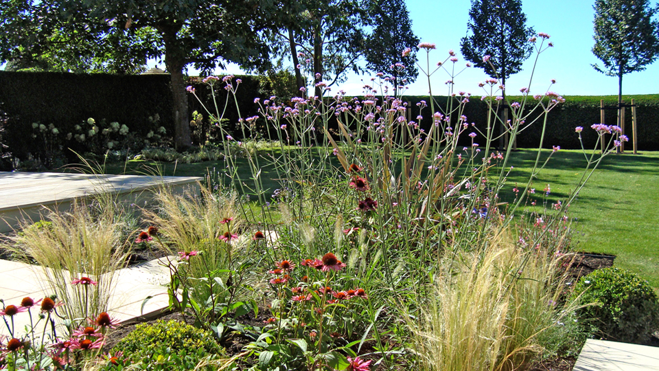 Box balls which echo the formality of the existing hedges, are surrounded by lush grass and perennial planting, softening the edges of the hard landscaping. The planting becomes less formal as it moves out into the garden towards the countryside.