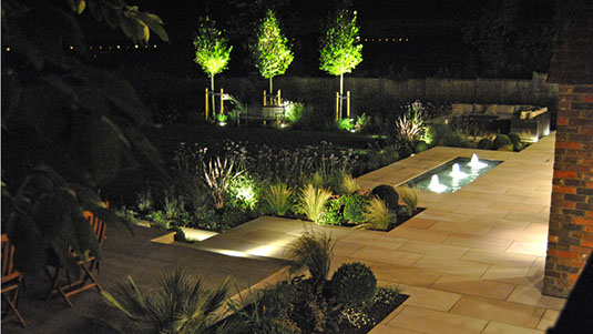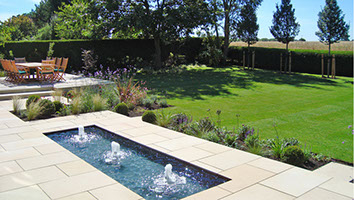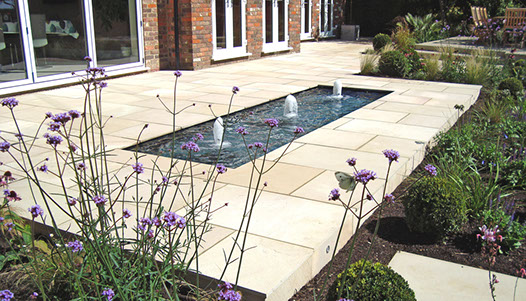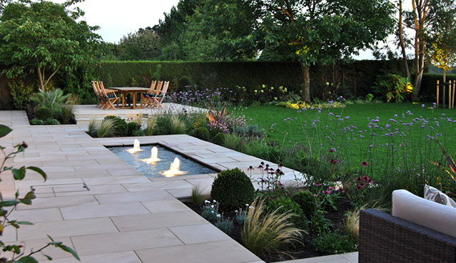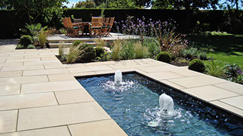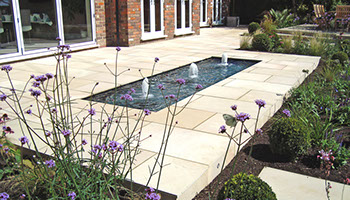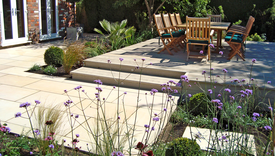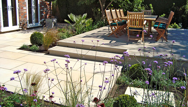 Smooth sawn sandstone was teamed with Millboard deck in complementary colours to create the level changes.