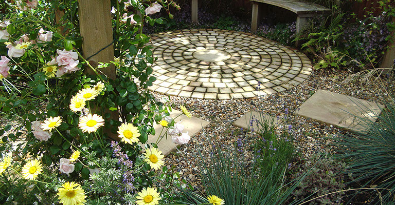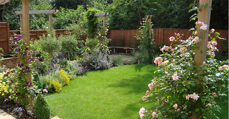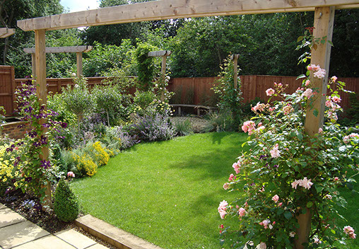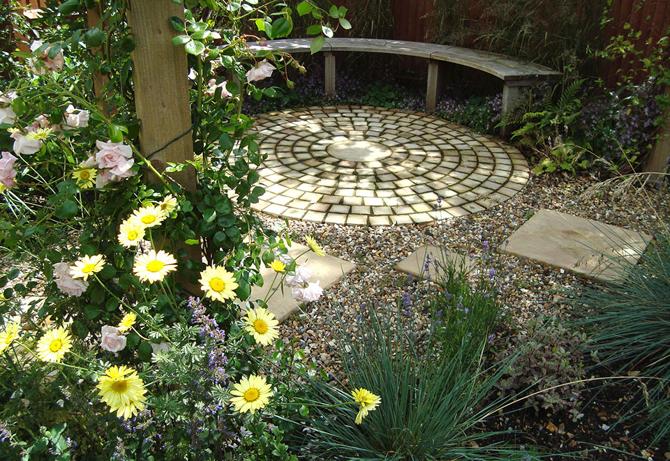 The existing patio was extended to allow for more expansive entertaining. A curved stepping stone path beneath scented, climber-clad arches now leads to a small circular seating area - for a relaxing gin and tonic in the late afternoon sun.